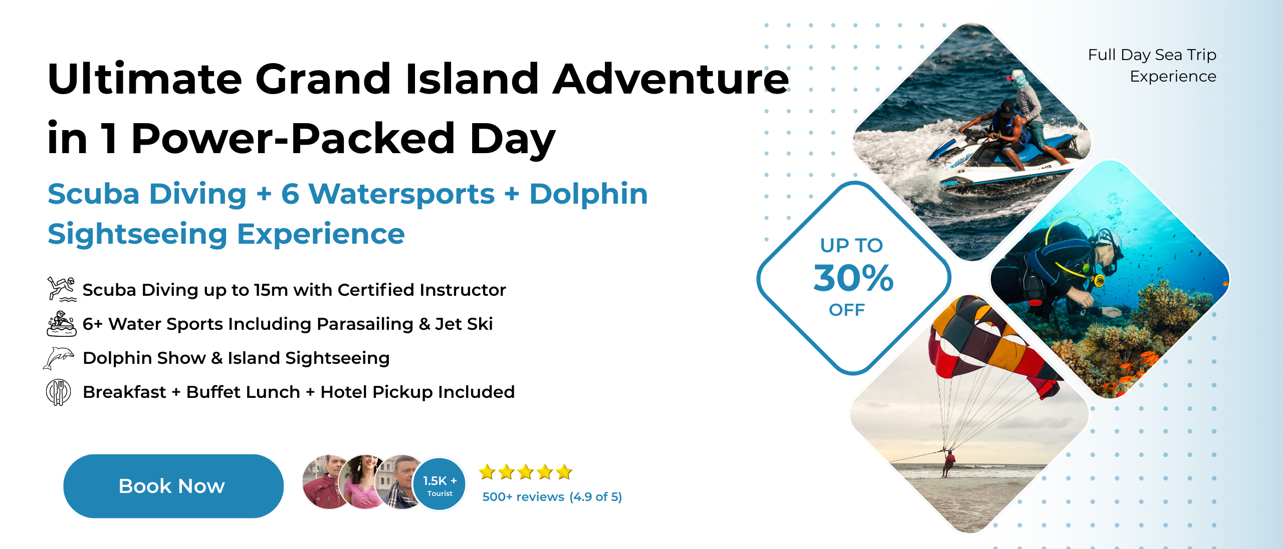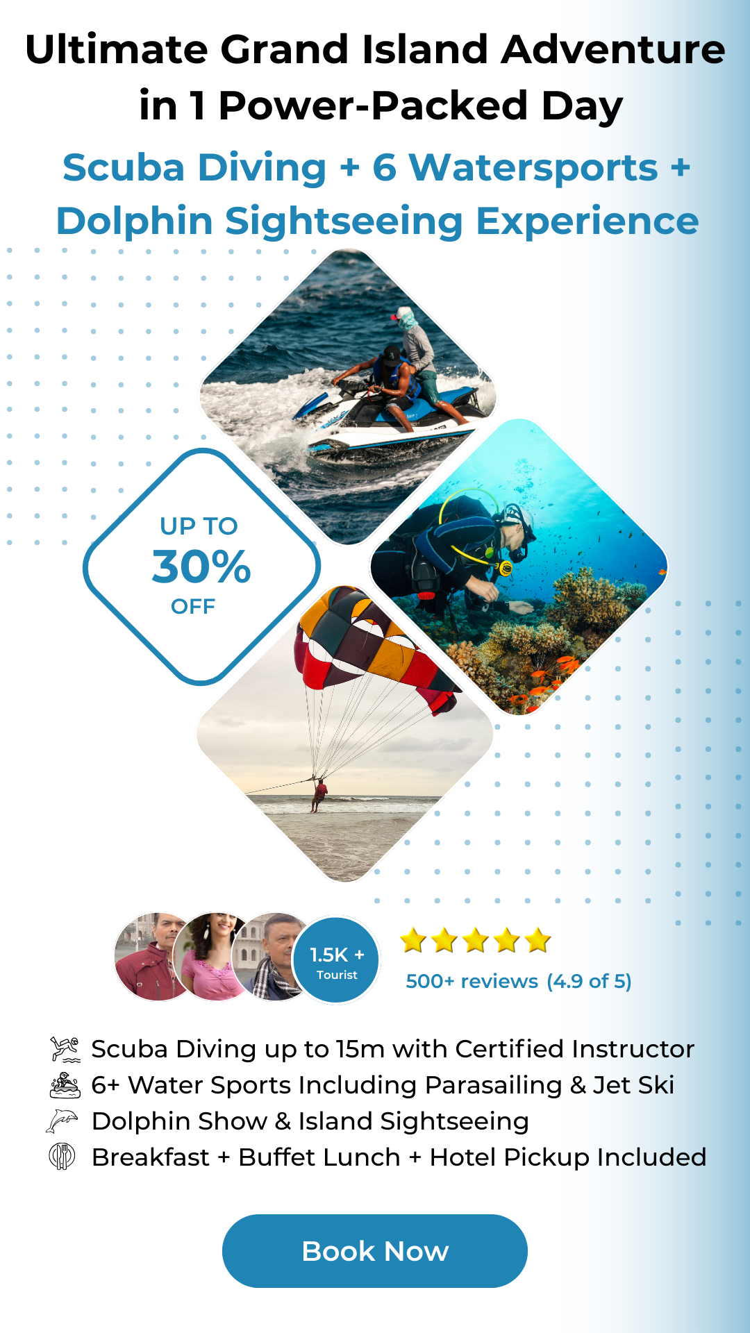Premium Grand Island adventure including scuba diving, parasailing, thrilling water sports, buffet meals and dolphin spotting during a scenic Arabian Sea trip.